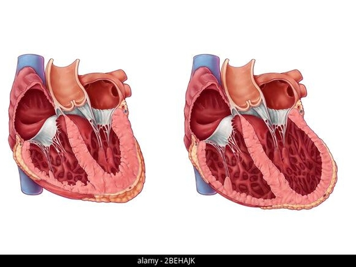 (图示:正常心脏与心衰心脏的结构对比,左侧为健康心脏的正常泵血状态,右侧为心衰心脏扩大、泵血效率下降的状态