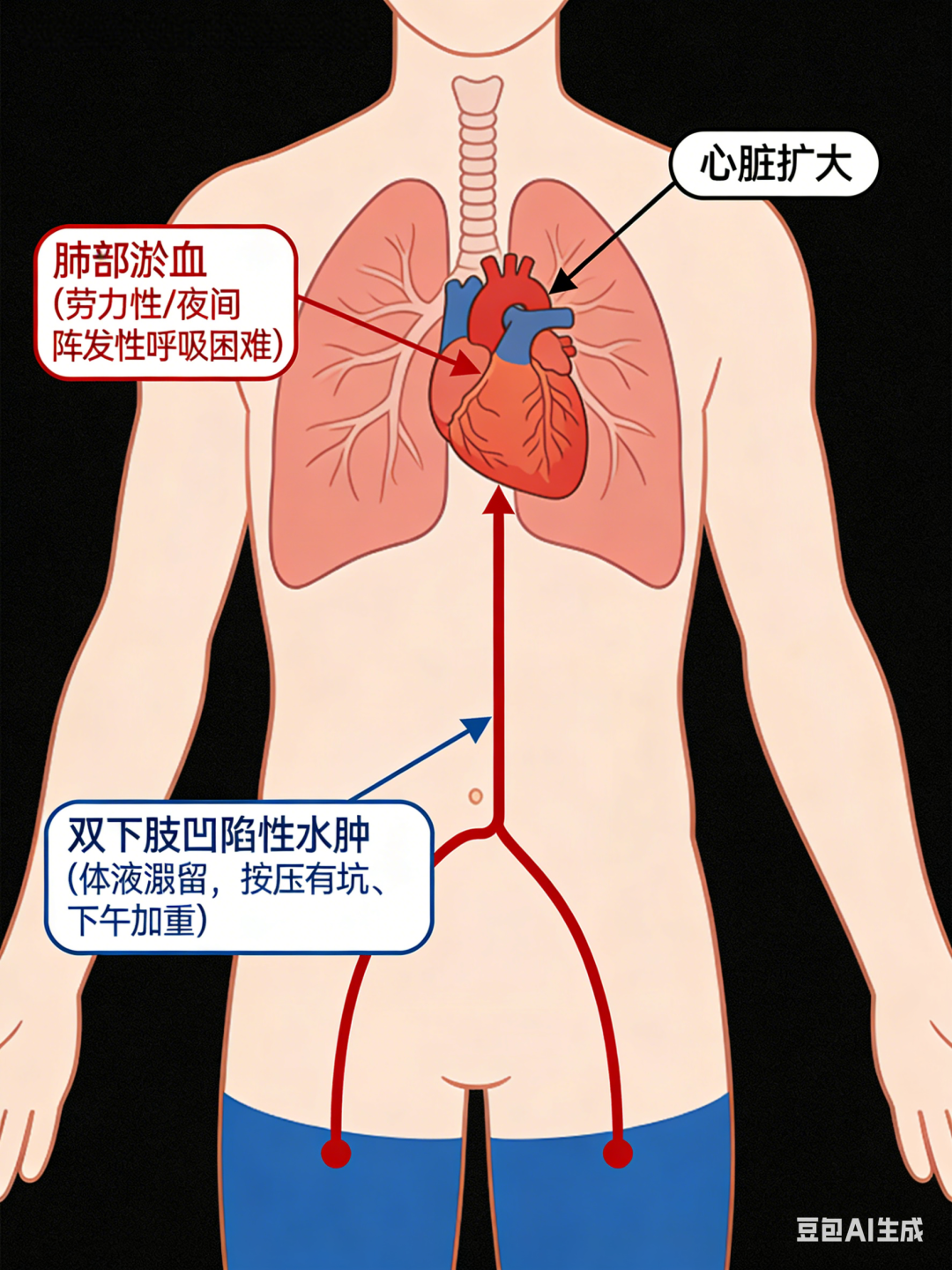 心衰症状多隐匿,早期易被误判为 “老毛病”,核心表现可总结为 “喘、肿、累”: