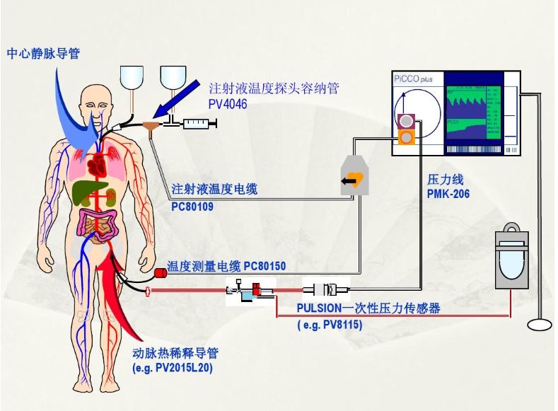 PiCCO(pulse index continuous cardiac output)脉搏指示连续心输出量监测是一种操作简单,微创的血流动力学监测手段。只需为患者置入中心静脉及动脉导管,而不需要置入肺动脉导管的新一代容量监测仪。该监测仪采用肺热稀释方法测量单次的心输出量,并通过分析动脉压力波形曲线下面积来获得连续的心输出量,同时还可监测容量指标、心脏指数、血管张力指标、血管外肺水指数等多种指标为危重患者的下一步治疗方案提供实时循证参考。