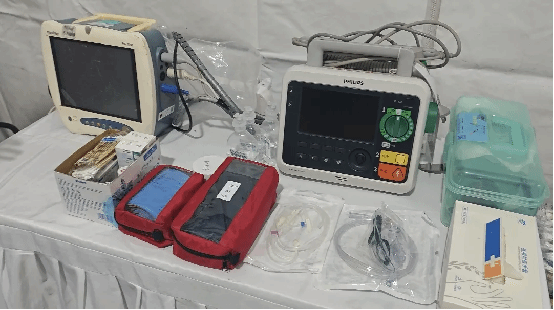 10月19日凌晨4点,天还未亮,市九院医务科主任侯鹏飞带领医护人员整理设备、整装出发。抵达保障区域后,急救床、担架、简易呼吸器、氧气装置、心电监护仪等设备迅速到位,每一件器械的精准摆放,都为后续救援争取了宝贵时间。