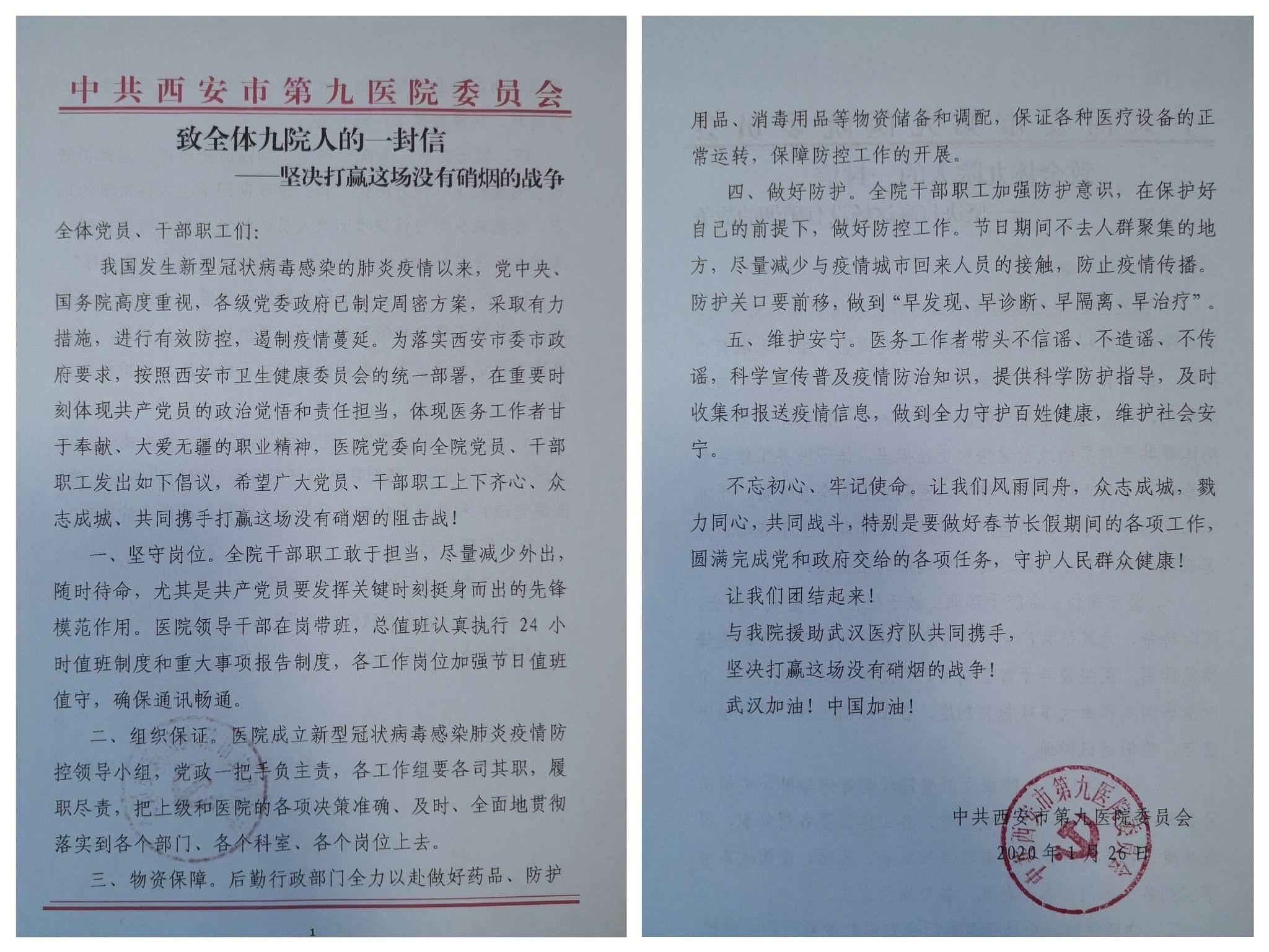 1月26日,西安市第九医院党委向全体干部职工发出《致全体九院人的一封信——坚决打赢这场没有硝烟的战争》,号召全院广大党员、干部职工以实际行动践行医学誓言,以严谨的科学精神和坚韧不拨的毅力抗击疫情,上下齐心、众志成城,共同携手打赢这场没有硝烟的阻击战。