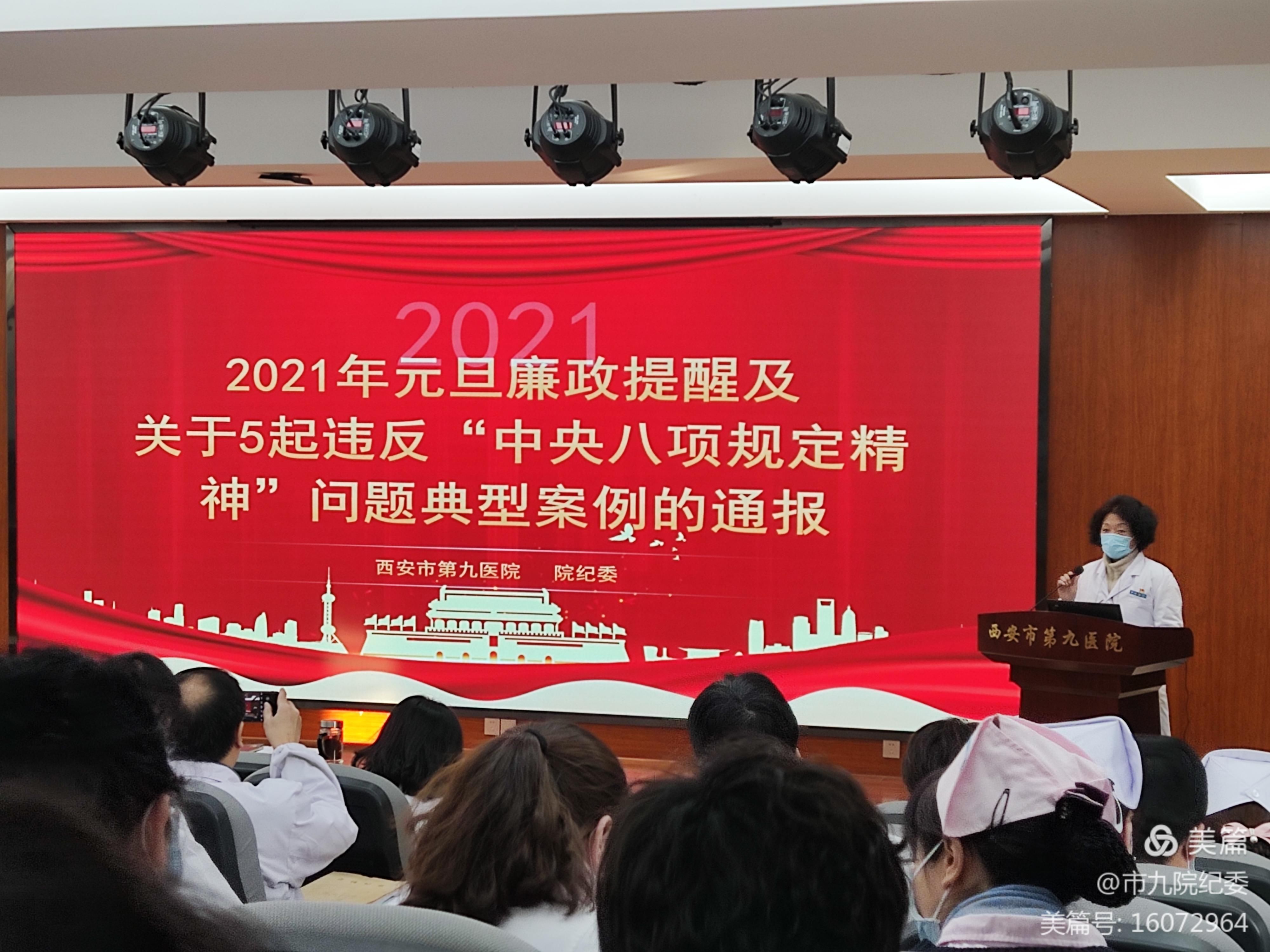 至此2021年新元旦来临之际,为进一步强化监督执纪问责,牢固树立党员领导干部廉洁自律底线。 12月30日下午,市九院纪委书记胡翔在院周会上向院领导班子成员及中层以上党员干部传达《市九院2021年元旦廉政提醒及关于5起违反“中央八项规定精神”问题典型案例的通报》。