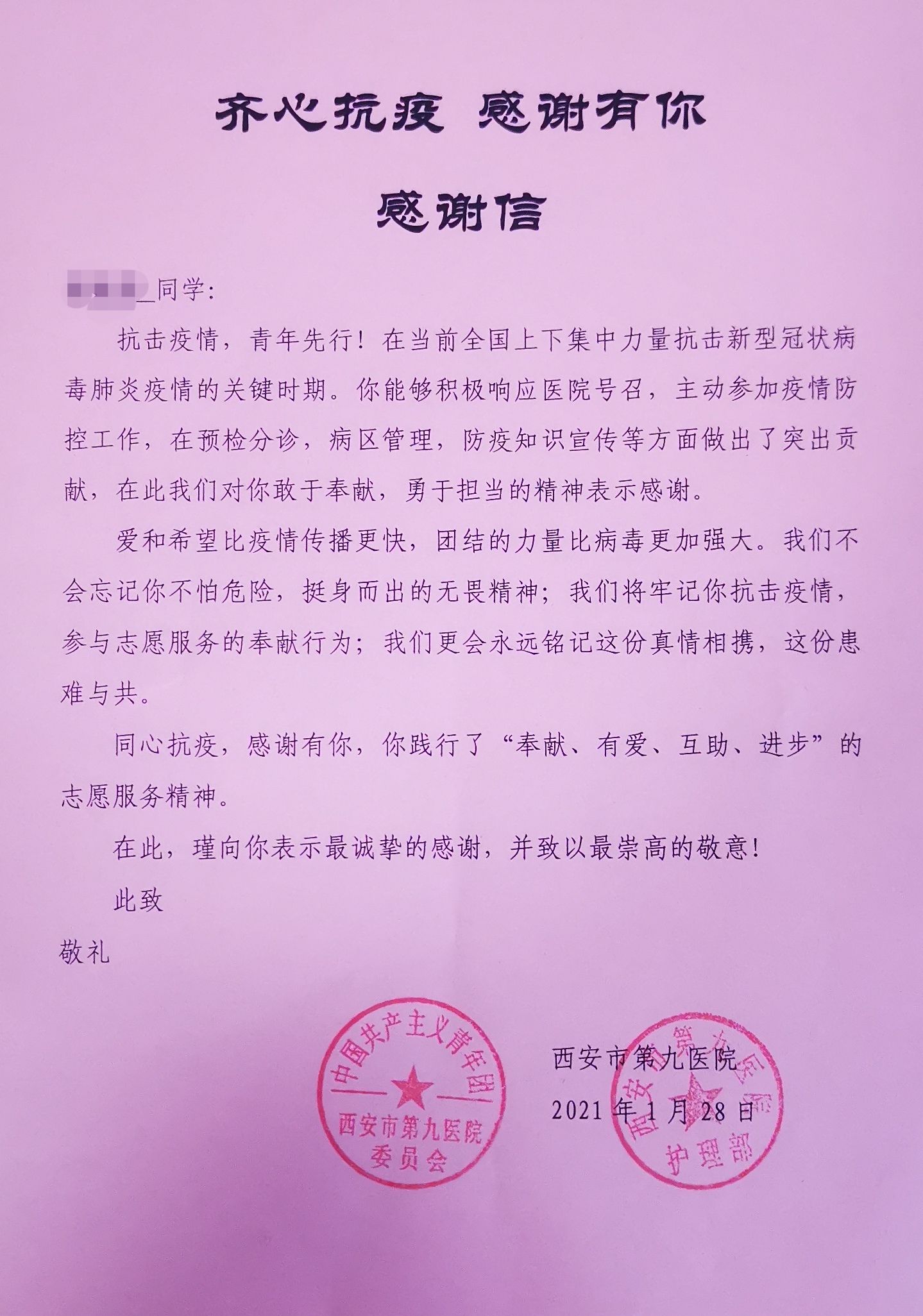 2020年是不平凡的一年,今年的实习工作,跟防疫抗疫紧密相连,我院护理实习生积极参与到疫情防控工作中,展现了当代大学生的优良品质与责任担当。为感谢他们的努力与付出,我院为每一位参与疫情防控工作的同学特制作了感谢信。护理部主任陈艳宣读“齐心抗疫,感谢有你”感谢信。