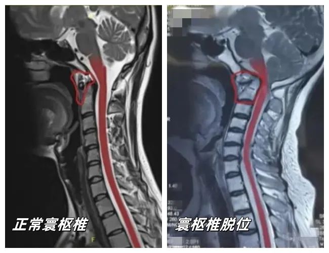 正常人颈椎枢椎的骨性突起和脊髓之间没有压迫。而寰枢椎脱位的患者,枢椎的骨性突起后移,会压迫后方脊髓,导致脊髓变得非常纤细,这个区域恰好是延髓和脊髓交界的区域,也正好是呼吸和心跳中枢所在的位置,所以压迫严重的病人可能出现高位截瘫或呼吸循环障碍,甚至危及生命。