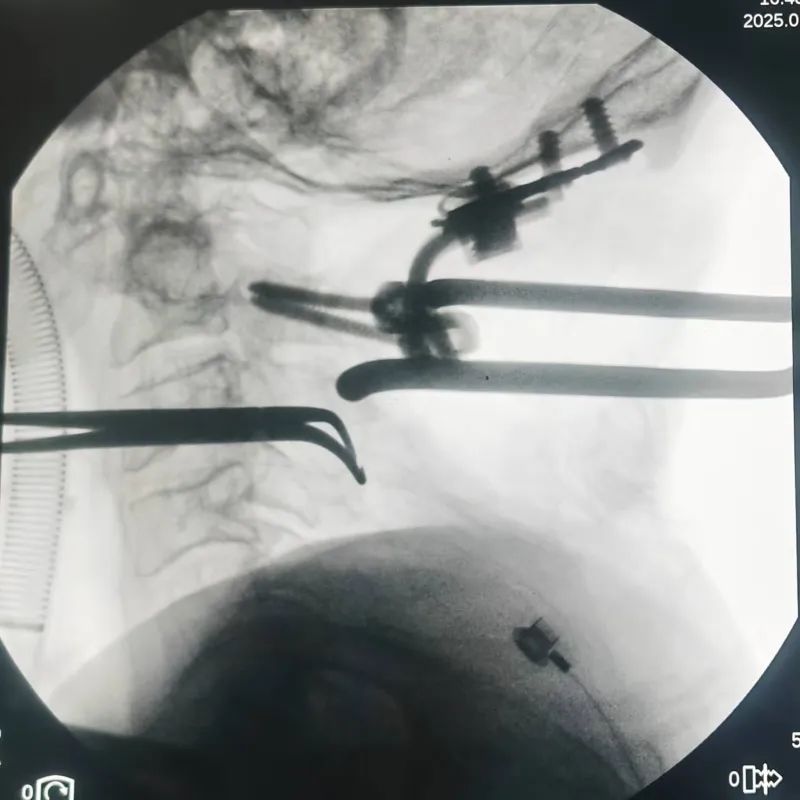 术中医生们根据3D模型精准选择固定方式,并在显微镜下精细操作,不仅有效减少了出血,还成功避开椎动脉等重要颅内供血动脉,顺利完成椎体固定及融合。术后,患者寰枢椎复位情况理想,恢复良好,已顺利出院继续康复。