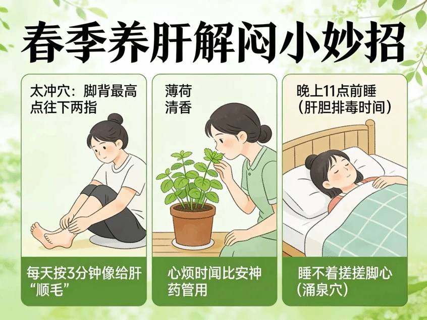 答:太有关了!中医说“肝主情志”,春天肝气往上冲,就容易心烦、失眠、叹气。解闷小妙招: