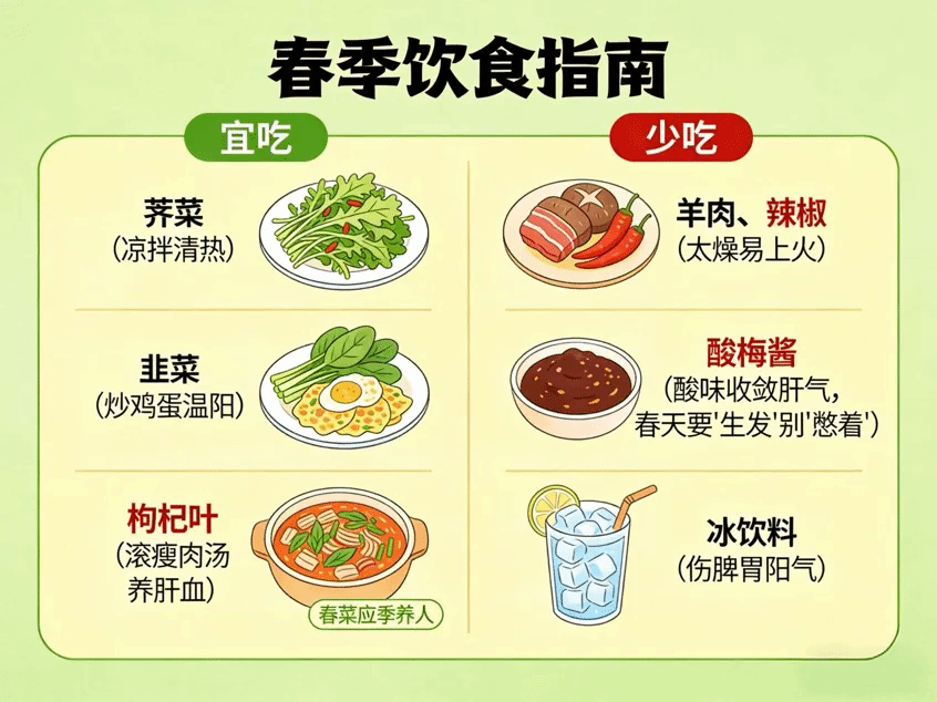 少吃:羊肉、辣椒(太燥易上火)、酸梅酱(酸味收敛肝气,春天要“生发”别“憋着”)、冰饮料(伤脾胃阳气)。