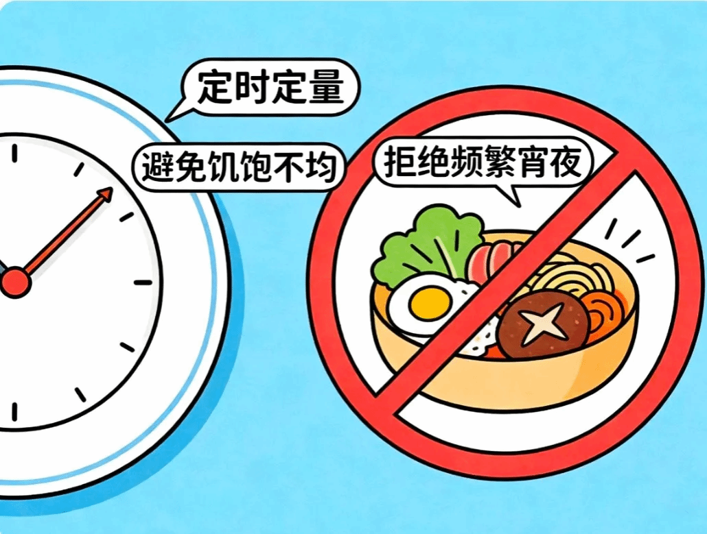 保持定时定量的饮食习惯,避免饥一顿饱一顿或频繁宵夜,以减轻胰腺负担。