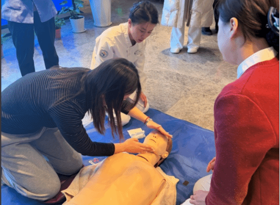 随后,在市民游客服务中心一楼大厅,急诊科郝钧萍、杨玥萌两位护师为工作人员及现场游客进行了心肺复苏和海姆立克急救法的技能培训。通过理论讲解、示范演示与“手把手”实操指导,有效提升了参训人员在突发状况下的应急救护能力,为生命安全保障再添一道防线。