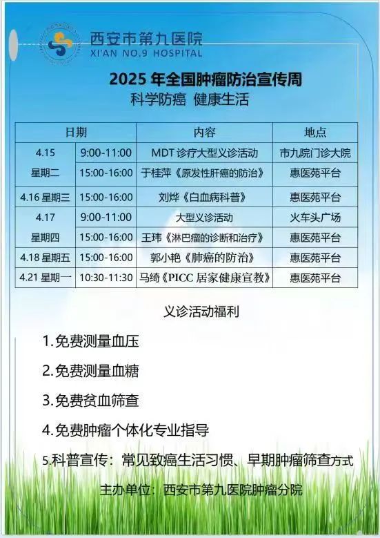 为了让更多群众了解肿瘤防治知识,更好地服务患者,4月15日上午,西安市第九医院肿瘤分院在门诊大院举行了一场大型义诊活动。此次义诊汇聚了肿瘤内科、放疗科、胸外科、检验科、消化内科、超声科、普外科等多个科室,形成了多学科联合诊疗(MDT)模式。活动内容涵盖肿瘤预防、诊断、治疗、康复等各个方面,吸引了多位患者朋友前来咨询交流。专家们耐心地为患者答疑解惑,根据患者的具体情况提供专业的建议和指导。