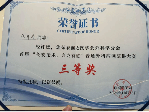 在2025年10月25日举办的“丝路新境界”西安医学会外科学分会2025年学术年会暨“长安论术,言之有道”普通外科病例演讲大赛中,西安市第九医院普通外科张升涛医师凭借其精彩的病例汇报《腹腔镜保脾胰体尾切除术(Kimura法)》,荣获大赛三等奖,展现了扎实的专业功底与卓越的临床思辨能力。
