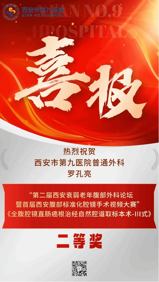 2025年11月22日,由西安医学会主办、西安交通大学第一附属医院承办的“第二届西安衰弱老年腹部外科论坛暨首届西安腹部标准化腔镜手术视频大赛”在西安成功举办。在本次大赛的激烈角逐中,西安市第九医院普通外科罗孔亮医生凭借其精湛技艺,其参赛作品《全腹腔镜直肠癌根治经自然腔道取标本术-III式》在众多优秀作品中脱颖而出,荣获大赛二等奖。