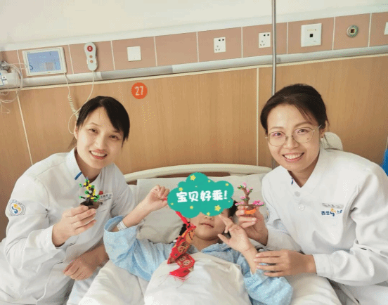 小洁的故事只是暖心护理的一个缩影。为了让这7位来自商洛贫困家庭和福利院的"蜗牛宝宝"得到最好的照顾,医院早在入院前就组建了多学科医护团队,黄垚副院长带队每日多学科联合查房,确保围术期安全,而护理部更是精心部署,陈艳主任、潘金副主任及外科大护士长周会菊,跨科室协调儿童专用病房,营造温馨环境,让孩子们一入院就感受到家的温暖;手麻系统大护士长张玉琴术中全程参与术中保障;科室安排N3级高年资护士担任"儿童专护"全程陪伴,从入院评估、术前宣教、术后护理到康复指导,专护阿姨们全程陪伴,她们不仅要完成专业的护理操作,还会哄孩子们吃饭、陪他们聊天、讲故事,在孩子们心中,她们就是病房里的"妈妈";考虑到孩子们年龄小、血管条件差等特点,护理团队主动邀请儿科护士长宋颖和高年资护士毛引妮协助护理工作。两科护理团队密切配合,共同制定个性化护理方案,从留置针穿刺、输液速度、用药剂量到营养支持,每一个细节都精心安排,在减少痛苦的同时,确保孩子们安全度过围术期。