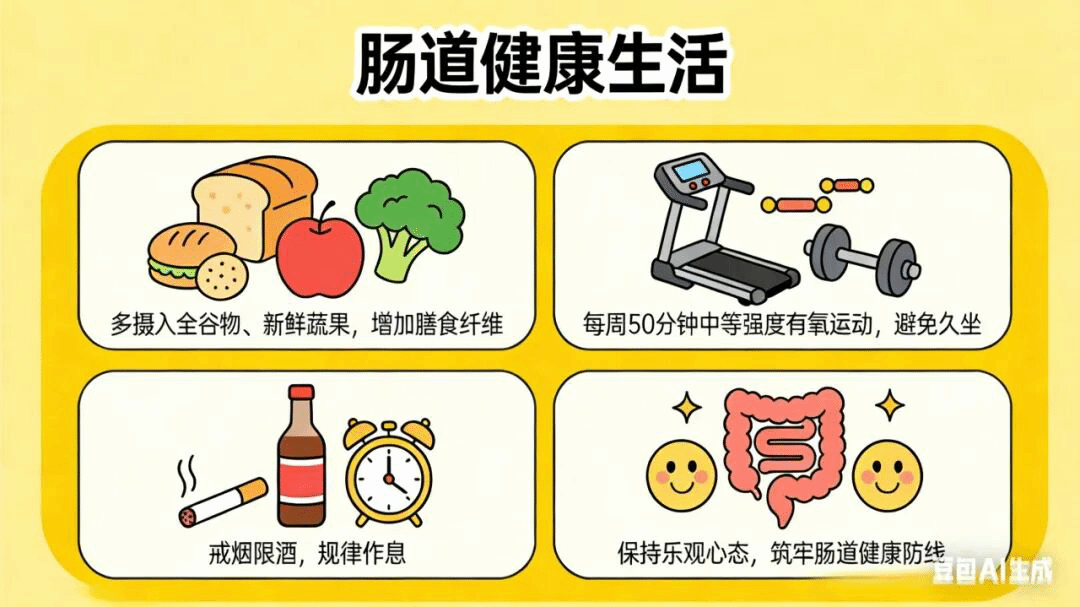 日常多摄入全谷物、新鲜蔬果,增加膳食纤维摄入,减少加工肉类与精制糖食用;每周保持150分钟中等强度有氧运动,避免久坐;戒烟限酒,规律作息,保持乐观心态,从生活点滴筑牢肠道健康防线。