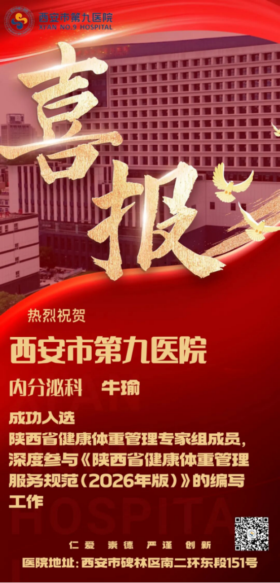 内分泌科主任牛瑜凭借在体重管理、内分泌代谢疾病诊疗领域的深厚造诣,成功入选陕西省健康体重管理专家组成员,深度参与《陕西省健康体重管理服务规范(2026年版)》的编写工作,为全省健康体重管理诊疗的规范化、同质化发展贡献九院智慧与方案。