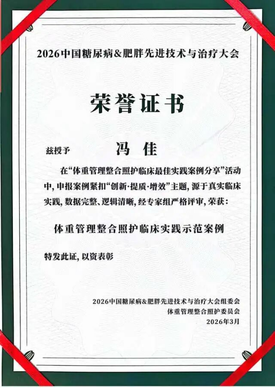 内分泌科副主任冯佳在“2026中国糖尿病&肥胖先进技术与治疗大会”上表现亮眼,其报送的糖尿病与肥胖相关临床病例《小减换衣服、大减换人生》,凭借诊疗思路的科学性、干预方案的个体化及临床疗效的显著性,获评大会示范病例,成为行业诊疗实践的优秀范本。