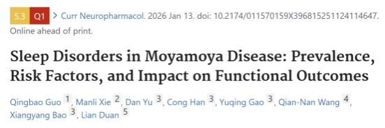 近日,西安市第九医院神经外科学科带头人郭清保博士作为第一作者,西安市第九医院为第一完成单位在国际神经药理学领域权威期刊 《Current Neuropharmacology》发表题为“Sleep Disorders in Moyamoya Disease: Prevalence, Risk Factors, and Impact on Functional Outcomes”的重要研究成果。该期刊2025年影响因子为5.3,在神经科学领域具有重要学术影响力。