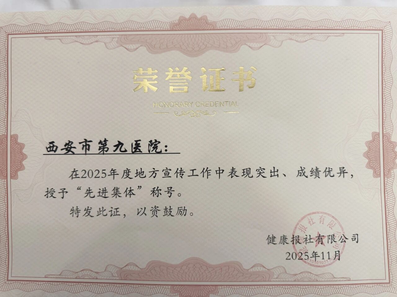 在健康报2025年地方宣传工作评选中,西安市第九医院荣获“优秀集体”称号,这一成绩的取得,是医院全体同仁共同努力的结果,更是对医院长期以来坚持正确宣传导向、务实... -