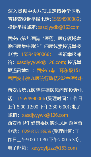 西安市第九医院成立于1958年,是一所集医疗、教学、科研、预防、保健、康复为一体的大型综合性现代化三甲医院。是国家住院医师规范化培训基地,西安市博士后创新基地,西北大学、延安大学医学院、西安医学院、陕西中医药大学临床教学医院及研究生联合培养基地。开放床位1500张,职工1800余人,其中专业技术人员1700余人,高级职称286人,博、硕士研究生414人,硕士生导师30人,国家、省市级专业学会主委、副主委100余人。共有临床医技科室52个(含沿线卫生所4个),设有心血管病院、脑血管病院、肿瘤病院、新丰精神病院4个院中院。