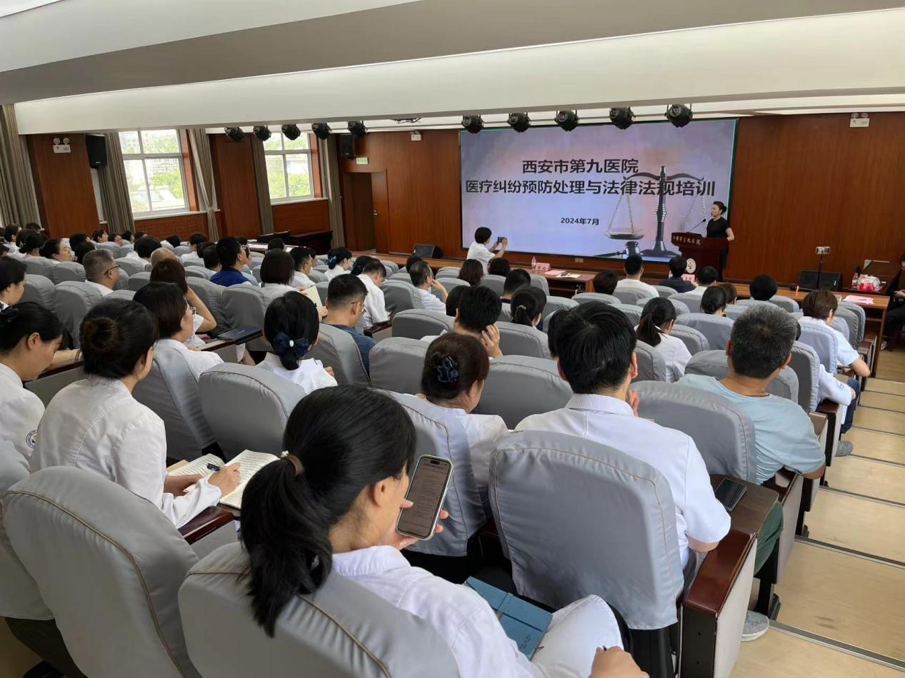 2024年7月25日下午,西安市第九医院医疗纠纷预防处理与法律法规培训会在学术报告厅举行。此次会议采用了线上与线下参会相结合的形式。行后、临床、医技科室的主任及副主任、护士长及副护士长总计 130余人现场参会,其余人员则通过线上方式参与。