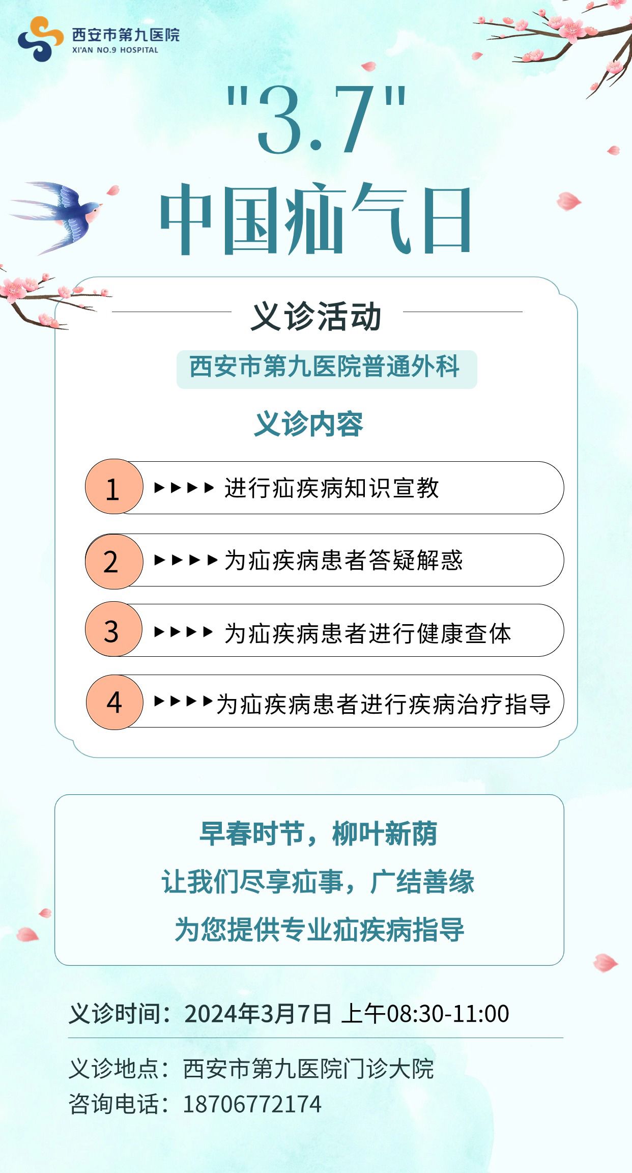 为庆祝第114个“三八”国际妇女节,西安市第九医院特举办大型联合义诊活动,义诊期间将提供疾病咨询、健康教育、用药指导、康复保健、免费测血压、测血糖、以及妇科检查优惠活动。