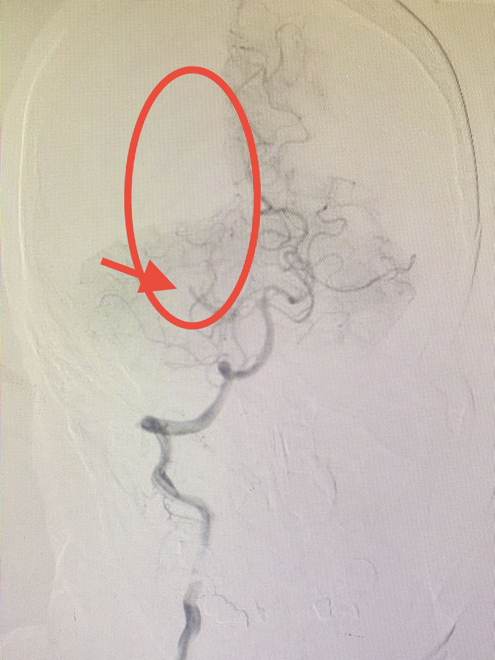 神经内科介入组立即开通绿色通道,5分钟完成造影检查,造影见:右侧大脑后动脉闭塞,闭塞残端杯口状,局部可见血栓影,考虑血栓栓塞。(图3)