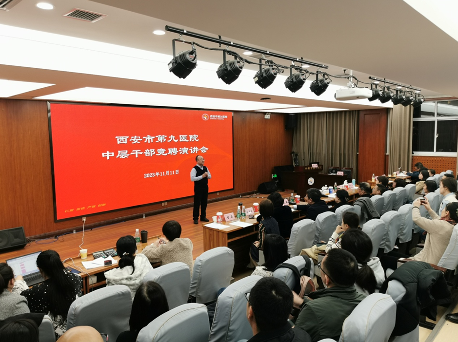 为全面推进医院内部管理体制改革,不断完善与医院发展相适应的用人制度,助力医院高质量发展,建立起一支精干、高效的医院干部队伍,根据《中共西安市第九医院委员会关于印发2023年度中层干部聘任实施方案的通知》要求,西安市第九医院于11月10至11日在学术报告厅分别举办了临床医技、行政职能、护理三个场次中层干部竞聘演讲会。院领导班子全体成员、参加竞聘演讲全体人员、评委、职工代表和会场工作人员140余人参加本次演讲大会。