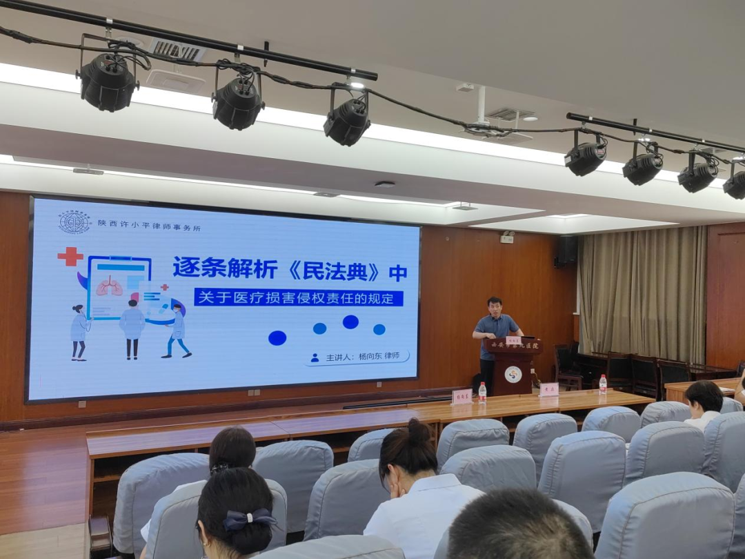 为持续提升全院干部职工法律素养,强化依法执业与风险防范意识,近日,我院在学术报告厅成功举办二季度法律法规专项培训。本次培训特邀我院法律顾问陕西许小平律师事务所行政与医疗法律专业委员会副主任杨向东律师担任主讲嘉宾,全院中层干部及业务骨干一百余人参加了培训。