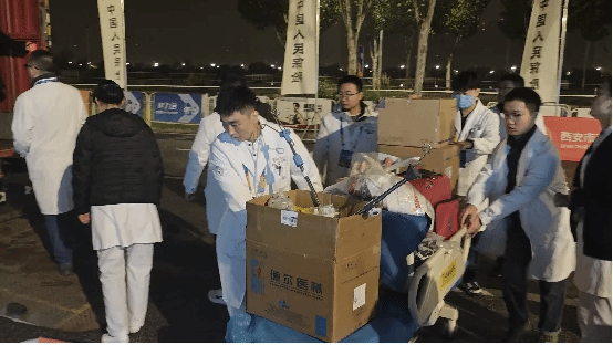 10月19日凌晨4点,天还未亮,市九院医务科主任侯鹏飞带领医护人员整理设备、整装出发。抵达保障区域后,急救床、担架、简易呼吸器、氧气装置、心电监护仪等设备迅速到位,每一件器械的精准摆放,都为后续救援争取了宝贵时间。