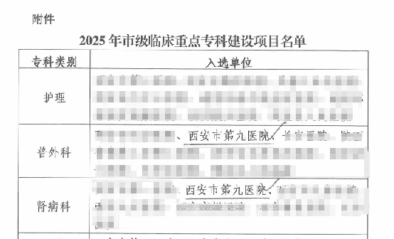 近日,西安市卫生健康委员会正式公示2025年市级临床重点专科建设项目名单,我院普通外科与肾脏内科凭借扎实的学科基础、突出的技术优势及优质的医疗服务,双双成功入选。