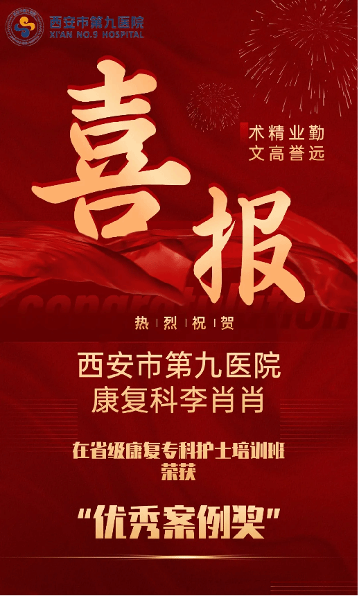 近日,西安市第九医院康复科护士李肖肖在为期三个月的“陕西省第五批康复专科护士培训班”中表现优异,在个案汇报环节荣获“优秀案例奖”,充分展现了九院康复护理团队的专业能力与人文关怀精神。