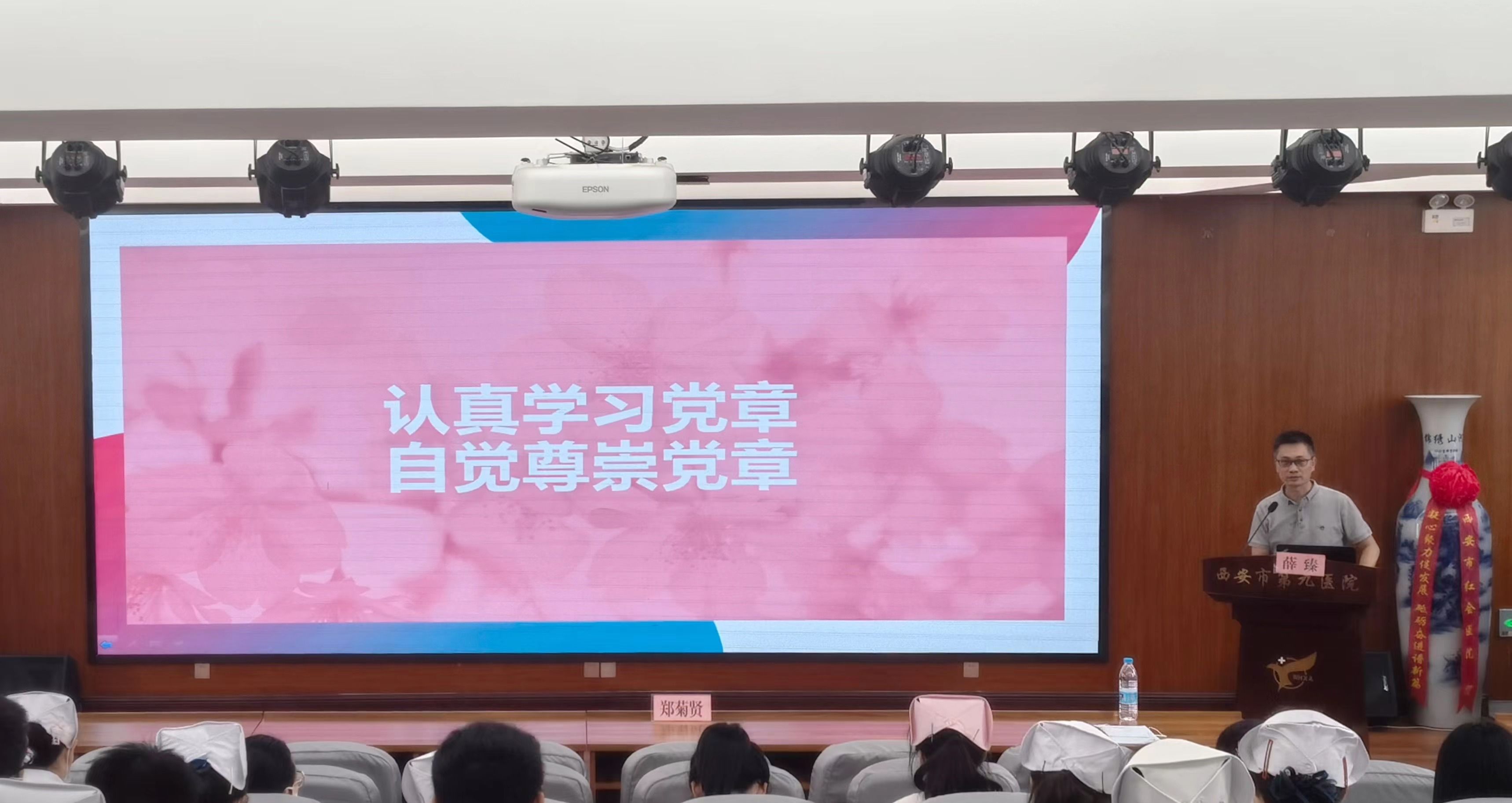 6月17日市卫健委组织处副处长薛臻为市九院全体积极分子和党员发展对象讲述了一堂深刻的党课《认真学习党章 自觉尊崇党章》,此次主题党课由党办主任王毅主持,薛臻副处长主讲,全体入党积极分子、党员发展对象近百人参加了本次主题党课。