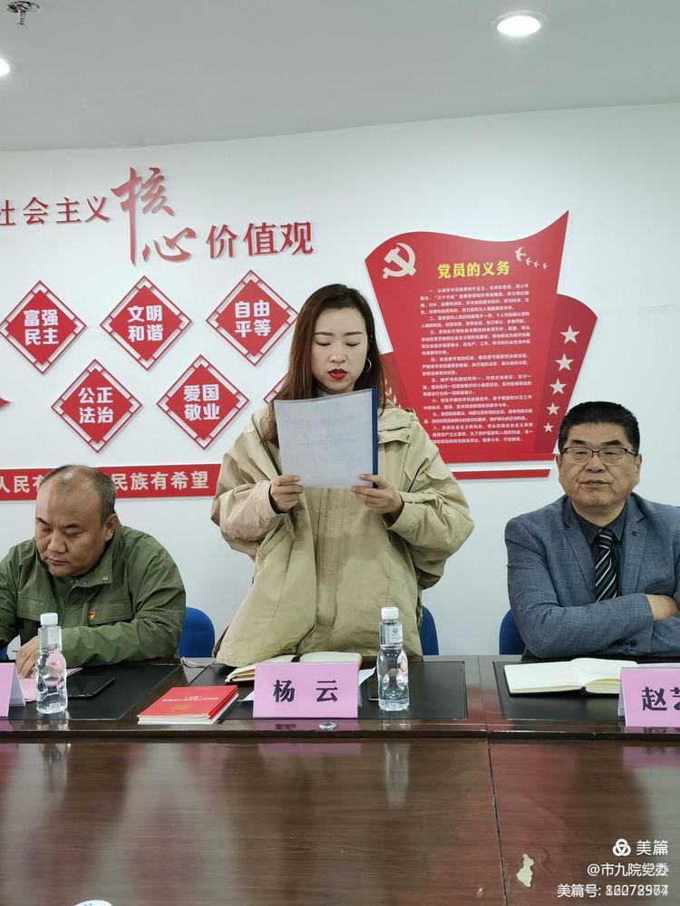 她说道:“一要创新活动方式,提高组织生活质量。二要发挥党支部的战斗堡垒作用。三要充分发挥党员的先锋模范作用。雄关漫道真如铁,而今迈步从头越。西安市第九医院党委会一如既往的协助、指导贵院的党建工作,让我们以习近平新时代中国特色社会主义思想为指导,在市卫健委党委、东关南街街道党工委的坚强领导下,在医院的改革建设和高质量发展中,雄赳赳、气昂昂,向着全面建设健康中国战略的新征程,书写白衣天使的奋进之笔!”