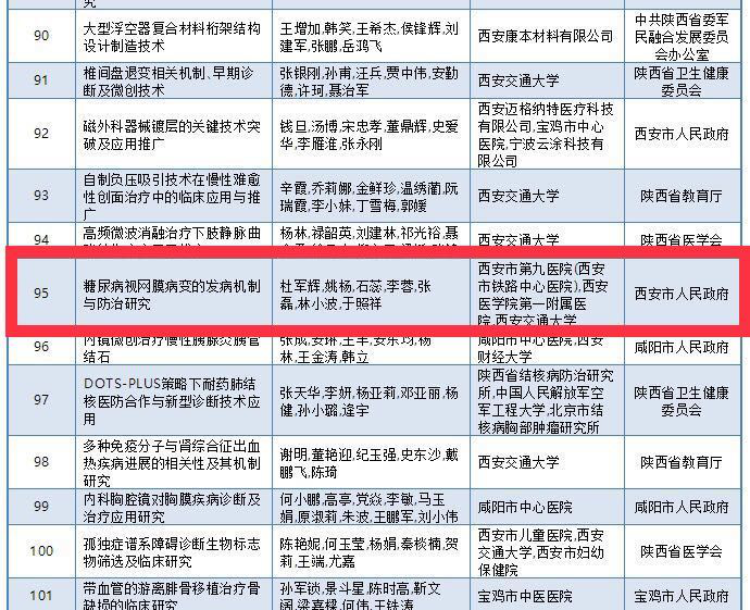 2019年度,陕西省科学技术奖专业评审共有4项省最高科学技术奖、1项省国际科学技术合作奖和260项陕西省“三大奖”(自然科学奖、技术发明奖、科技进步奖)通过专业评审。在公示项目中,共有6个眼科项目参与省奖的申报,西安市九院科研项目脱颖而出,是唯一获奖的眼科项目。