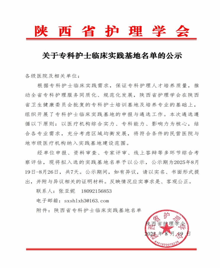8月19日陕西省护理学会公示2025年专科护士临床实践基地名单,西安市第九医院凭借扎实的专科实力与规范化管理,成功入选中医、烧伤整形、老年护理、糖尿病护理四大专业实践基地。