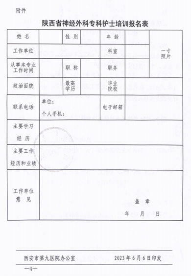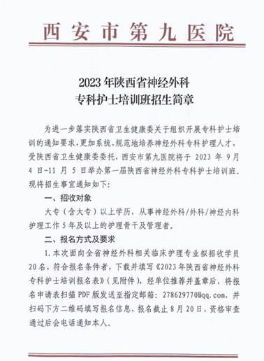 西安市第九医院第一届陕西省神经外科专科护士培训班将于 2023 年 9月 4 日-11 月 5 日举办,为全脱产学习,分为理论学习与临床实践两部分。本次面向全省神经外科相关临床护理专业拟招收学员20名,各项考核合格后,获得由陕西省卫生健康委颁发的《陕西省专科护士培训合格证书》。