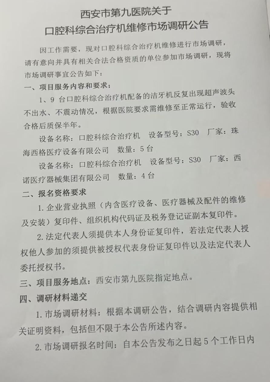 西安市第九医院关于口腔科综合治疗机维修市场调研公告
