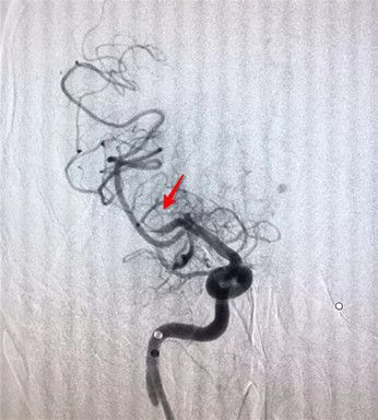 展会主任、张西安副主任医师及豆涛涛医师为患者行局麻下全脑血管造影术。术中见右侧颈内动脉支架远端及颅内段血管完全闭塞。右侧大脑半球通过左侧前交通动脉及右侧大脑前动脉有少量代偿。随后在全麻下,行颈内动脉球囊扩张,造影又发现大脑中动脉M1段也有闭塞、血流仍不通畅。这属于典型的串联病变,治疗难度大。神经外科医生没有犹豫,再行大脑中动脉内支架取栓术。经三次取栓后大脑中动脉完全通畅。术后给予少量的抗血小板治疗。经过4个多小时的手术,李师傅闭塞的血管终于开通了,脑组织恢复了血供,腹腔引流未见明显渗血,目前李师傅病情平稳,在进一步的恢复之中。