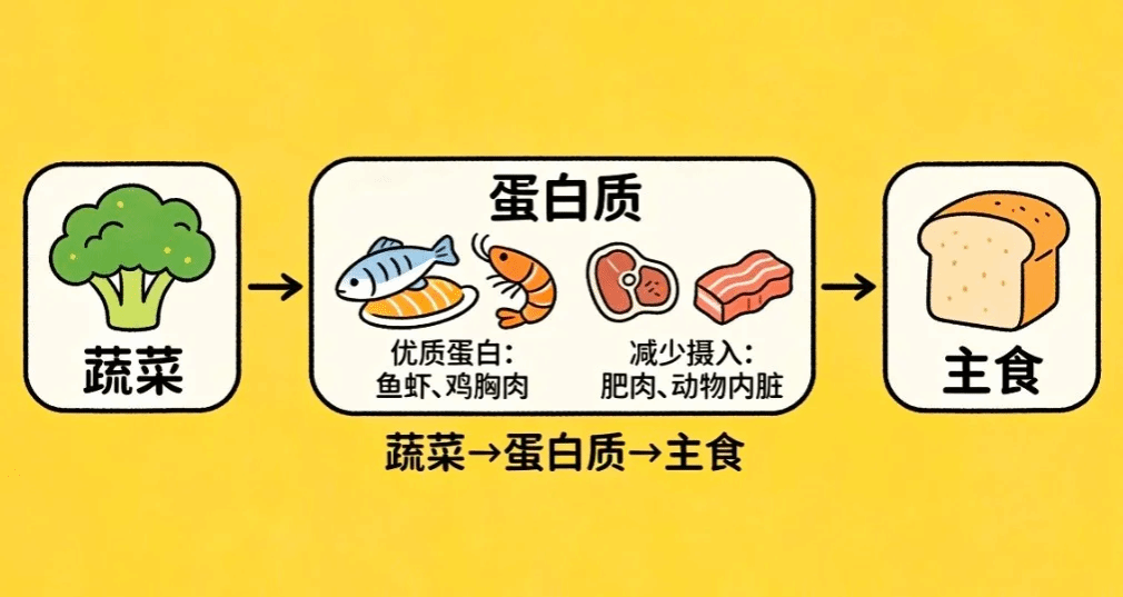 建议按“蔬菜 → 蛋白质 → 主食”的顺序进食。优先选择鱼虾、鸡胸肉等优质蛋白,减少肥肉和动物内脏的摄入。