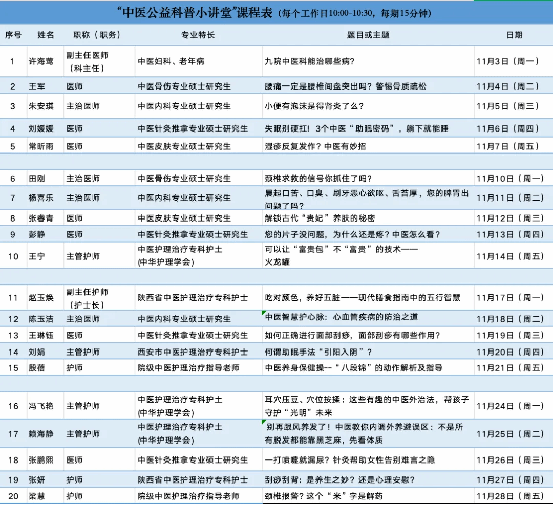 即日起,每个工作日上午中医科将安排一名医护在影像中心候诊区开展主题讲座,课程涵盖体质辨识、疾病防治、养生保健等多维度内容,具体安排如下: