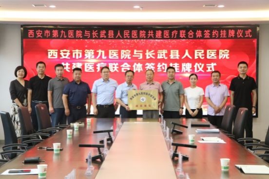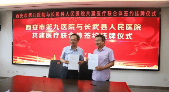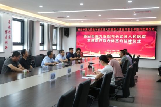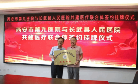 为深入贯彻落实国家医药卫生体制改革精神,推动优质医疗资源下沉,切实满足长武县人民群众日益增长的高质量医疗服务需求,7月24日上午,西安市第九医院与长武县人民医院共建医疗联合体签约授牌仪式在长武县人民医院隆重举行。标志着两院正式建立紧密型协作关系,共同开启深化合作、共促发展的新篇章。