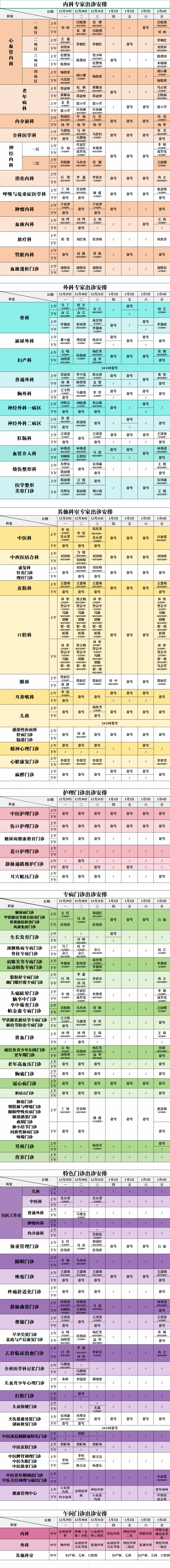 西安市第九医院门诊出诊安排(12.29-1.4)