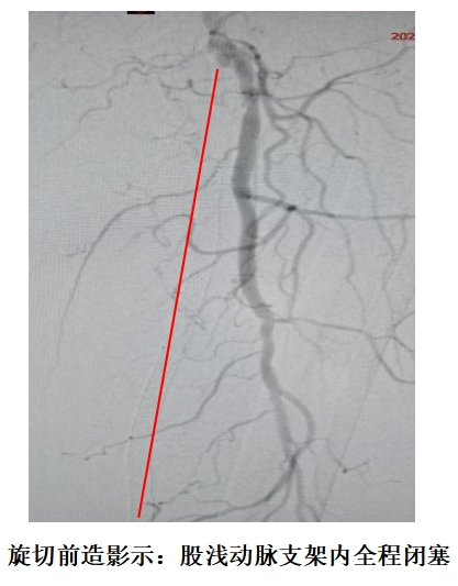 79岁男性患者赵某,因左下肢疼痛、发凉、行走困难1月入院,1年前曾行左股浅动脉动脉药物涂层支架植入术,现症状再次出现,考虑支架内再闭塞所致。且患者高龄、基础疾病较多,对手术耐受性要求极高。血管介入科手术团队经全面研究、细致讨论,决定采用新型的Jetstream血管斑块旋切抽吸系统实施微创治疗。