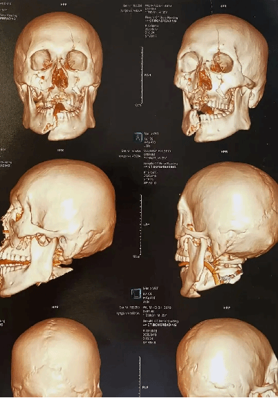 此时距离最佳手术时间已过去四周时间。上下颌骨、鼻骨的骨折早已发展为陈旧性骨折,叠加颈部脊髓损伤、脑挫伤、颅骨骨折、肋骨骨折、锁骨骨折、颈椎横突骨折,并伴有肺部感染,这些都就像给治疗套上了“层层枷锁”。