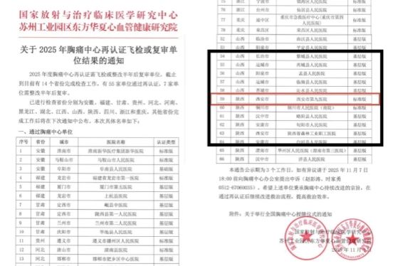 2025年11月4日,中国胸痛中心总部发布再认证结果,西安市第九医院顺利通过国家胸痛中心(标准版)再认证,标志着医院在胸痛救治体系建设、区域协同救治能力等方面持续达到国家标准,为西安市胸痛患者的生命安全提供了有力保障。