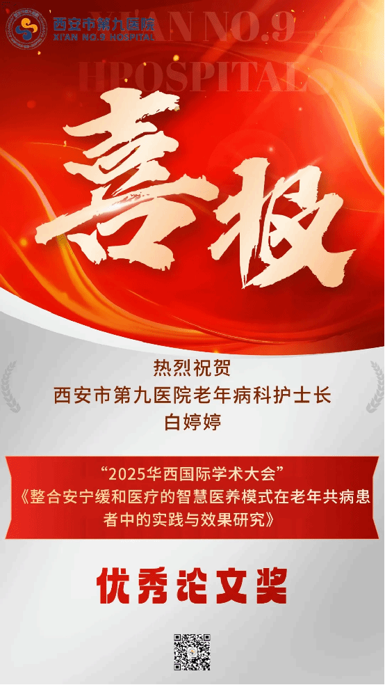 近期,于四川省医学科技创新研究会主办、四川大学华西医院协办的“2025 华西主动健康与老年护理发展国际学术大会”上,西安市第九医院老年病科护士长白婷婷所撰写的论文《整合安宁缓和医疗的智慧医养模式在老年共病患者中的实践与效果研究》,经大会专家组严格评审,荣获“优秀论文奖”。