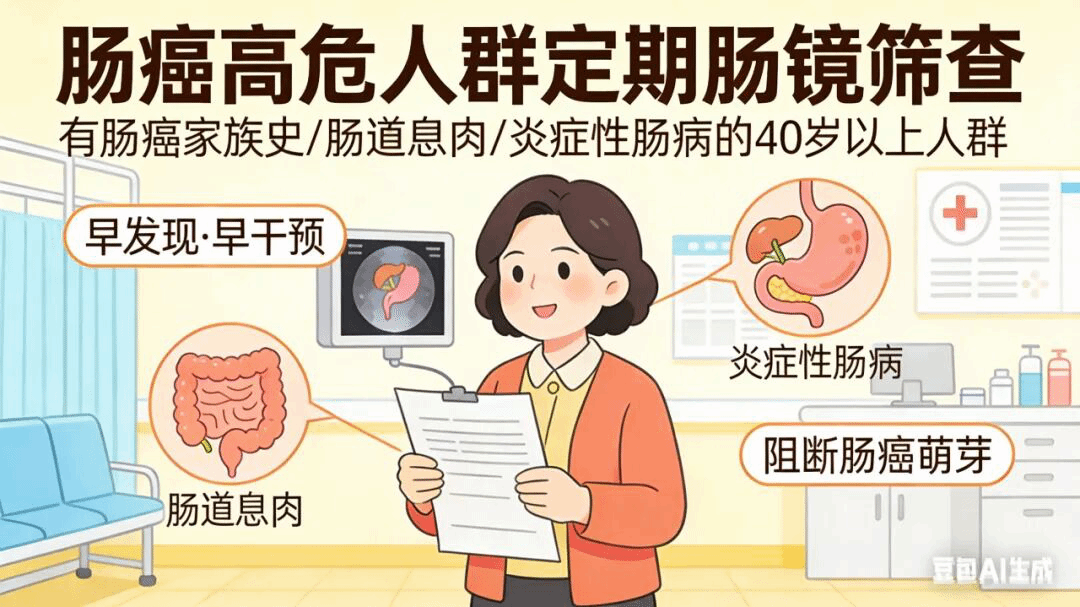40岁以上的有肠癌家族史、患有肠道息肉或炎症性肠病的高危人群,建议定期进行肠镜筛查,早发现、早干预,能将肠癌阻断在萌芽阶段。
