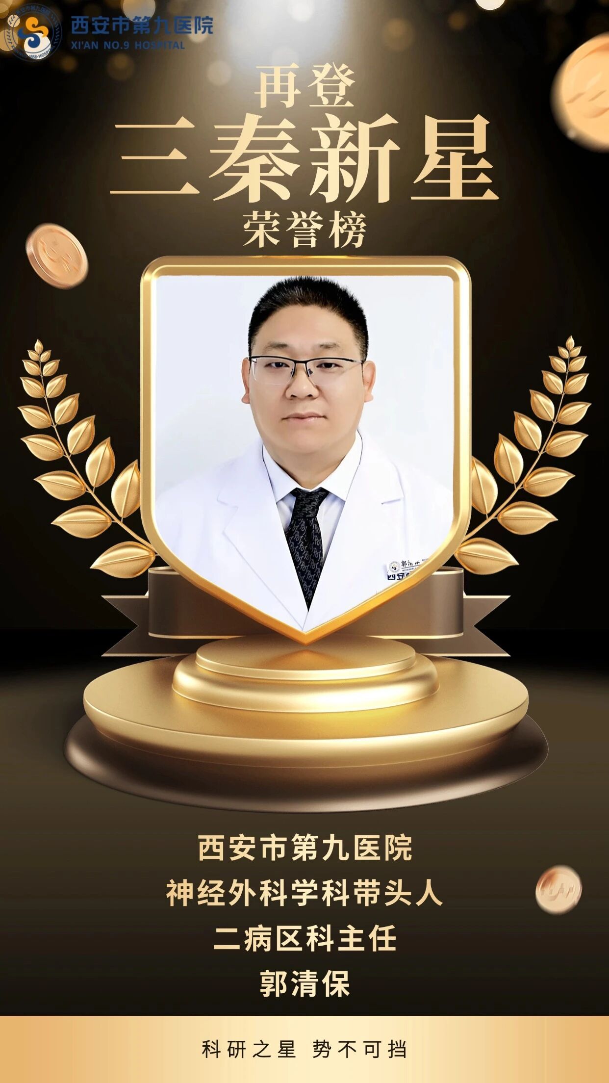 郭清保,医学博士,副主任医师,西安市第九医院神经外科学科带头人,二病区科主任,硕士研究生导师,中国医药教育协会神经外科专业委员会委员,陕西省创伤医学会常务委员兼秘书,陕西省脑与人工智能专委会委员。发表SCI27篇,其中IF超10分SCI两篇。第一作者累计总IF>100分,中文核心论文12篇、专家评述1篇,出版专著《现代神经外科疾病临床诊治略》,国家发明专利3项,完成军事课题多项。
