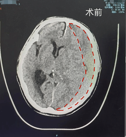 (王大爷头颅CT:红色虚线位置为慢性硬膜下血肿)