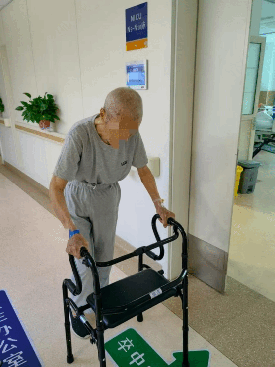 术后5天,不能下地的王大爷可以扶着助力器行走了,基本恢复到发病前的状态。